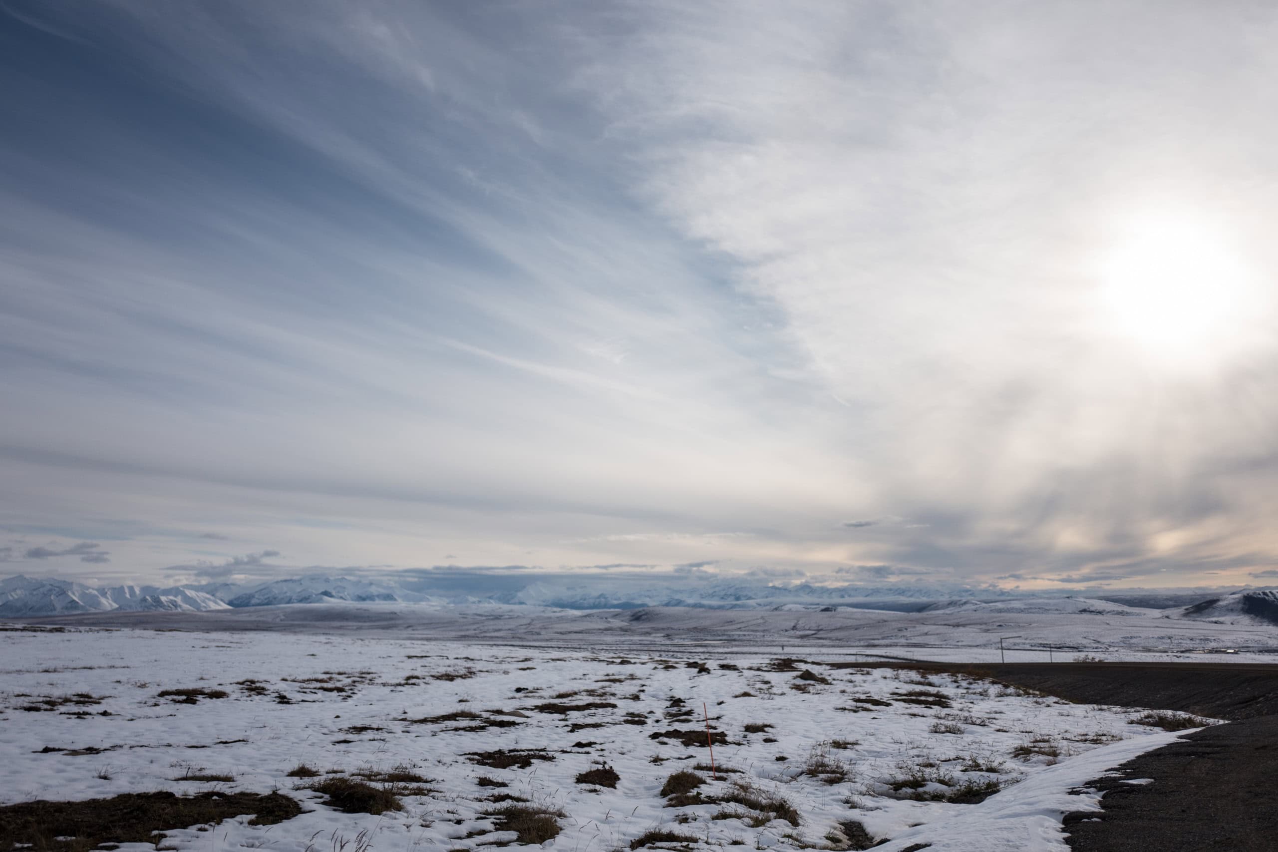 Driving down the north side of Ataguin Pass—known colloquially as “The North Slope,” a geographic happenstance that causes oil to pool up deep beneath Prudhoe Bay in quantities that outweigh the crushing reality of life in the Arctic Circle—I soaked in the surreal sights and even less believable cartographic situation. The tundra was buried beneath two-day-old snow, tall summer grasses now brown and flickering in the breeze. It seemed to go on forever in every direction, interrupted only by imposing the imposing east-west mountain range and the cold haze to the north. The sun skated across the sky slowly, casting a blinding pastel light across the landscape.